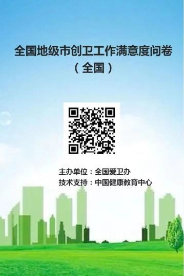 为全面了解您所在城市卫生创建和巩固情况,2024 年 1 月 10 日—24 日,全国爱卫办邀请您填写“创卫工作满意度” 线上问卷,请您根据自身实际感受,客观、公正地作出评价, 您的建议将为改善城市环境、提升城市管理提供重要参考。请扫描下方二维码积极参与吧!