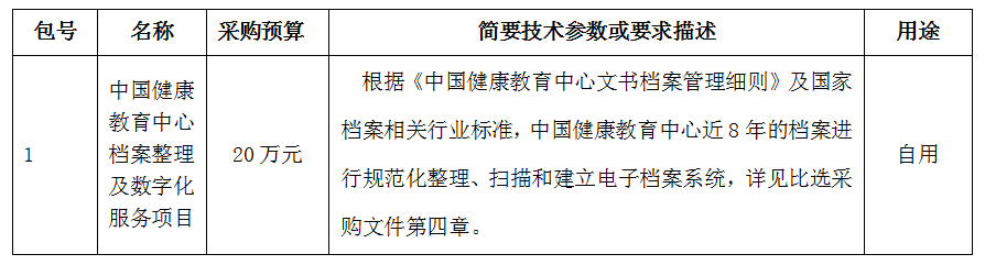 中国健康教育中心就 “中国健康教育中心档案整理及数字化服务项目”进行比选采购,现邀请合格供应商参加比选响应。