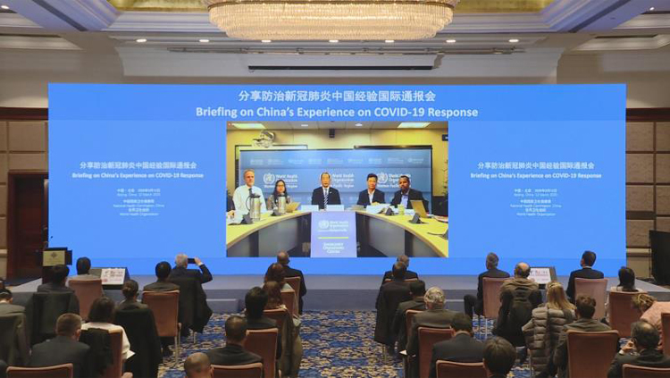 2020年3月12日,国家卫生健康委与世界卫生组织以多地视频连线形式共同举办分享防治新冠肺炎中国经验国际通报会,有关国家驻华使馆和国际组织代表在北京会场参加会议,世界卫生组织西太区与有关国家代表通过视频远程参会。