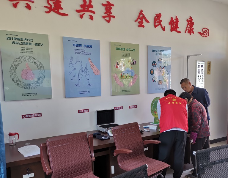 健康小屋志愿者指导村民开展健康自测