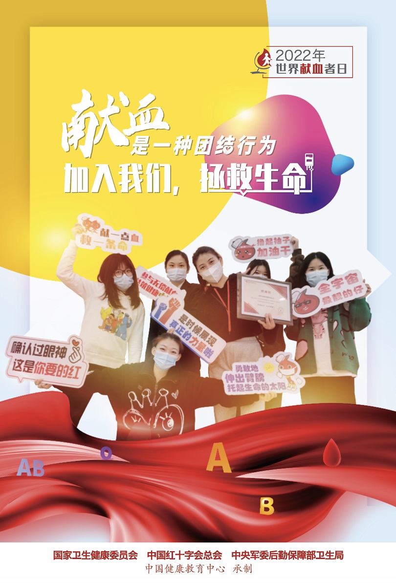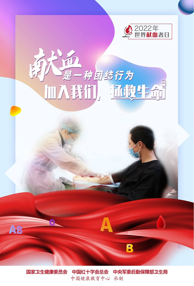 2022年6月14日是第19个世界献血者日,主题为“献血是一种团结行为。加入我们,拯救生命”。在国家卫生健康委医政医管局指导下,中国健康教育中心开发制作无偿献血宣传海报,呼吁更多人参与到无偿献血行动中来。