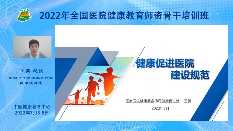 为了提升医疗卫生机构和医务人员开展健康教育服务的能力,作为加强健康教育专业人员能力建设的重要举措,2022年7月5—8日,中国健康教育中心(以下简称“中心”)采用线上线下相结合的方式,举办了2022年全国医院健康教育师资骨干培训班。中心纪委书记赵虹出席培训班并做开班动员,开班式由中心指导与培训部负责人程玉兰主持。