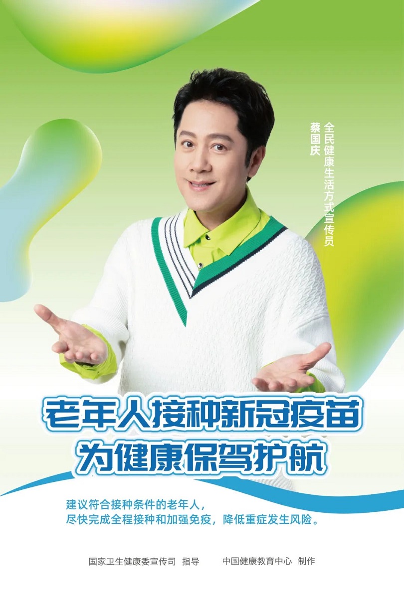 接种新冠病毒疫苗可以有效降低老年人感染后发生重症和死亡的风险。在国家卫生健康委宣传司指导下,中国健康教育中心邀请张宏民、鞠萍、蔡国庆、悦悦等名人共同参与,开发了“老年人接种新冠疫苗,为健康保驾护航”系列海报,倡议符合接种条件的老年人尽快完成全程接种和加强免疫,降低重症发生风险。欢迎大家传播使用。
