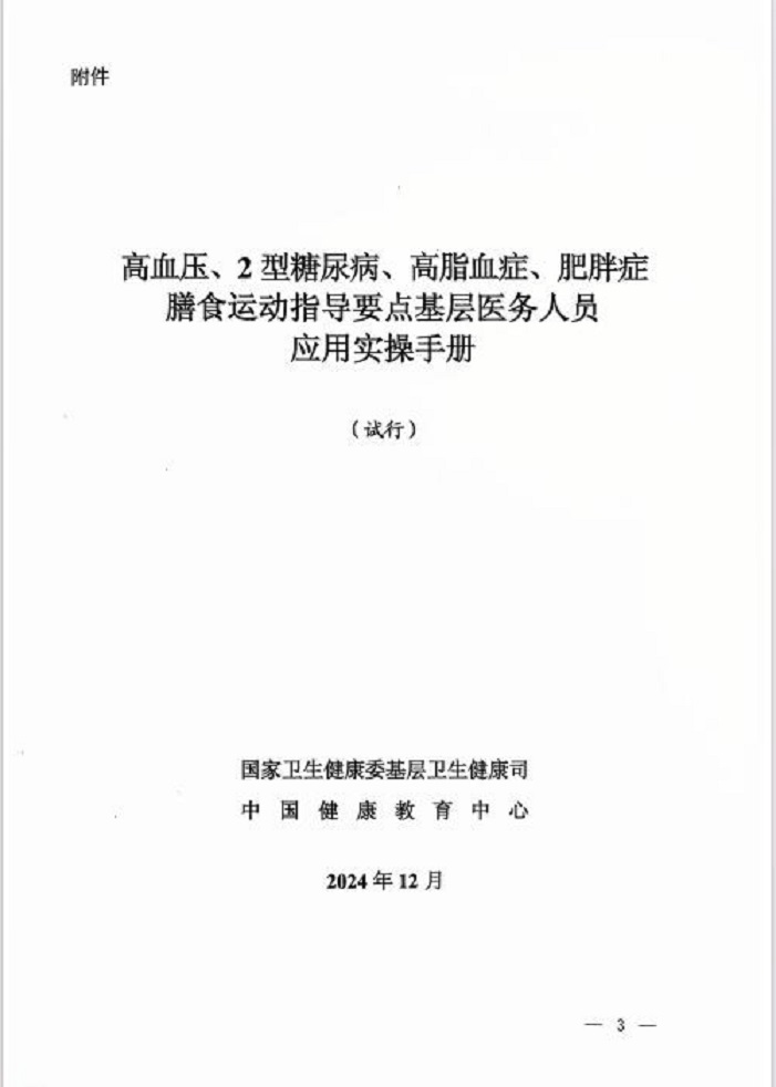 为了贯彻党的二十大和二十届三中全会精神,深入推进健康中国战略和健康优先发展战略,进一步落实《健康中国行动(2019-2030年)》,推进基层医疗卫生机构强化慢性病患者健康服务,提升健康管理效能,中国健康教育中心(以下简称“中心”)在国家卫生健康委基层卫生健康司的指导下,组织专家研究制定了《高血压、2 型糖尿病、高脂血症、肥胖症膳食运动指导要点基层医务人员应用实操手册(试行)》(以下简称《指导要点》)。